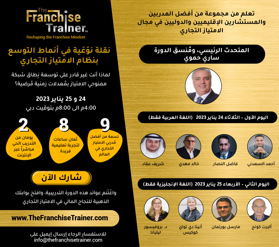 خصم خاص للشركات والمجموعات. الرجاء مراسلتنا على البريد الإلكتروني info@thefranchisetrainer.com